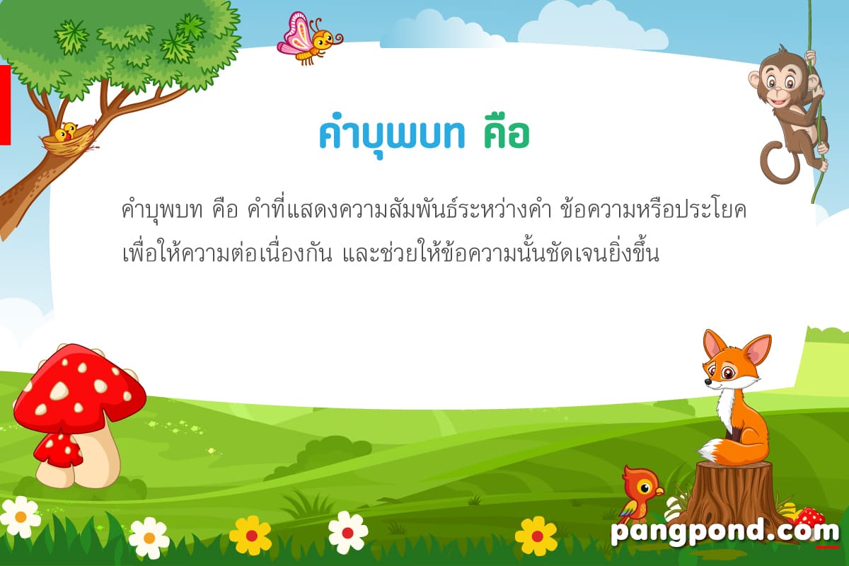 คำบุพบท คือ คำที่แสดงความสัมพันธ์ระหว่างคำ ข้อความหรือประโยค เพื่อให้ความต่อเนื่องกัน และช่วยให้ข้อความนั้นชัดเจนยิ่งขึ้น