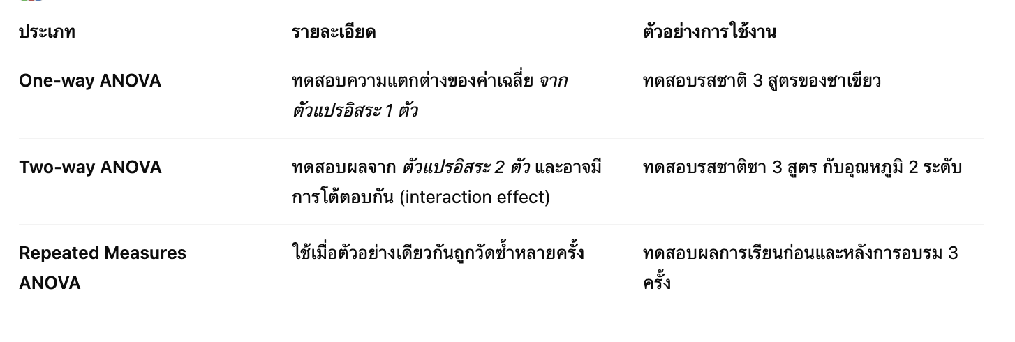 • ✅ ลดโอกาสเกิดข้อผิดพลาดจากการใช้ t-test หลายครั้ง
