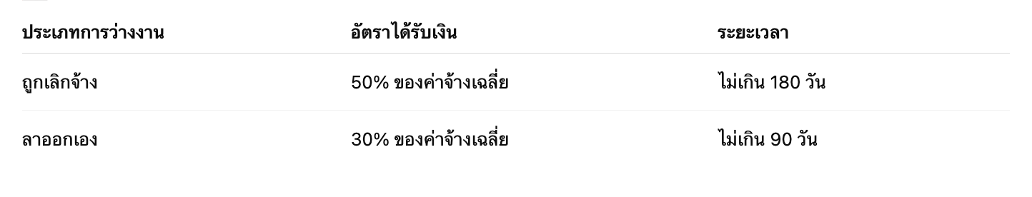 • ถูกเลิกจ้าง: ได้รับเงินชดเชย 50% ของค่าจ้างเฉลี่ย (ไม่เกิน 180 วัน)