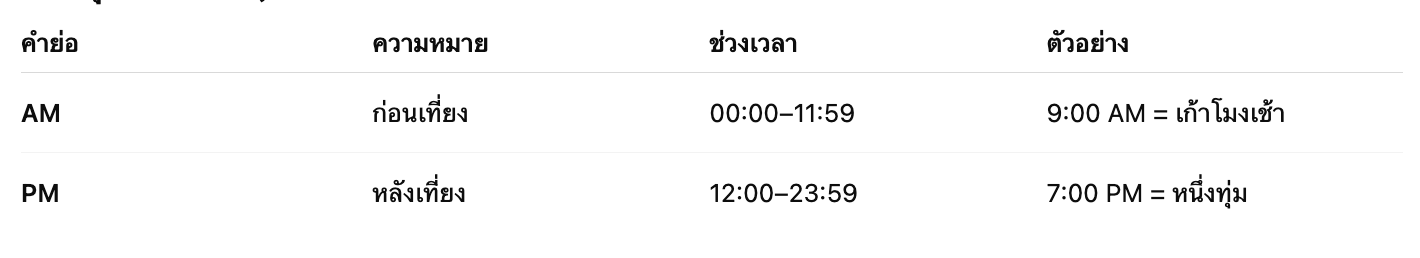 • AM = ก่อนเที่ยง (Ante Meridiem)