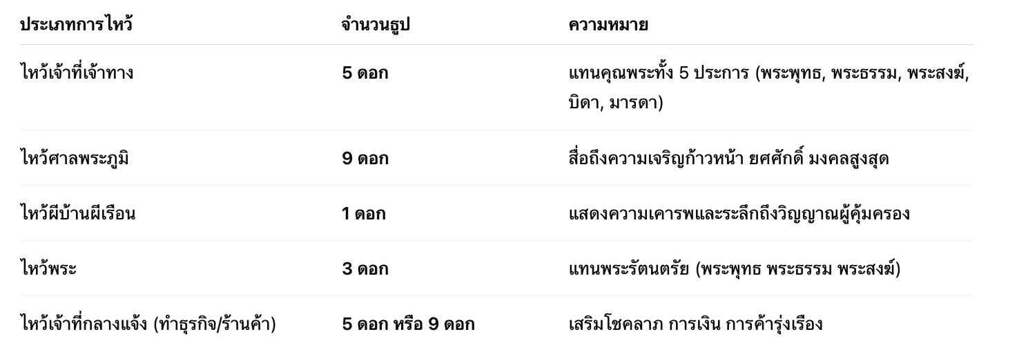 หากเป็นการ ไหว้เจ้าที่ประจำบ้านหรือหน้าร้าน ให้ใช้ ธูป 5 ดอก จะเหมาะสมที่สุด เพราะเป็นจำนวนที่นิยมและมีความหมายครอบคลุมทั้งด้านศิริมงคลและความเคารพ